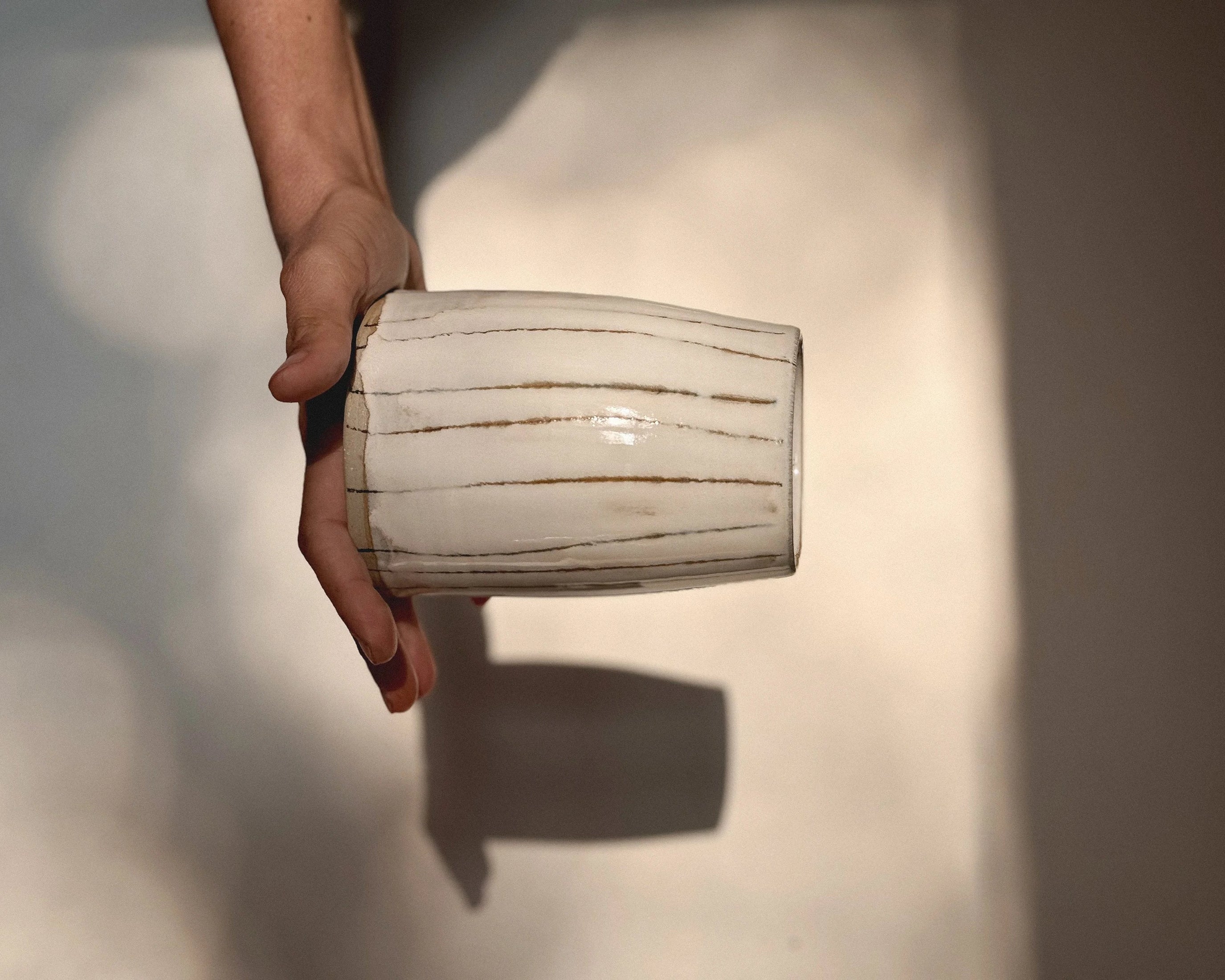 Jil Clay / tasse beige rayé vertical espacé - anse